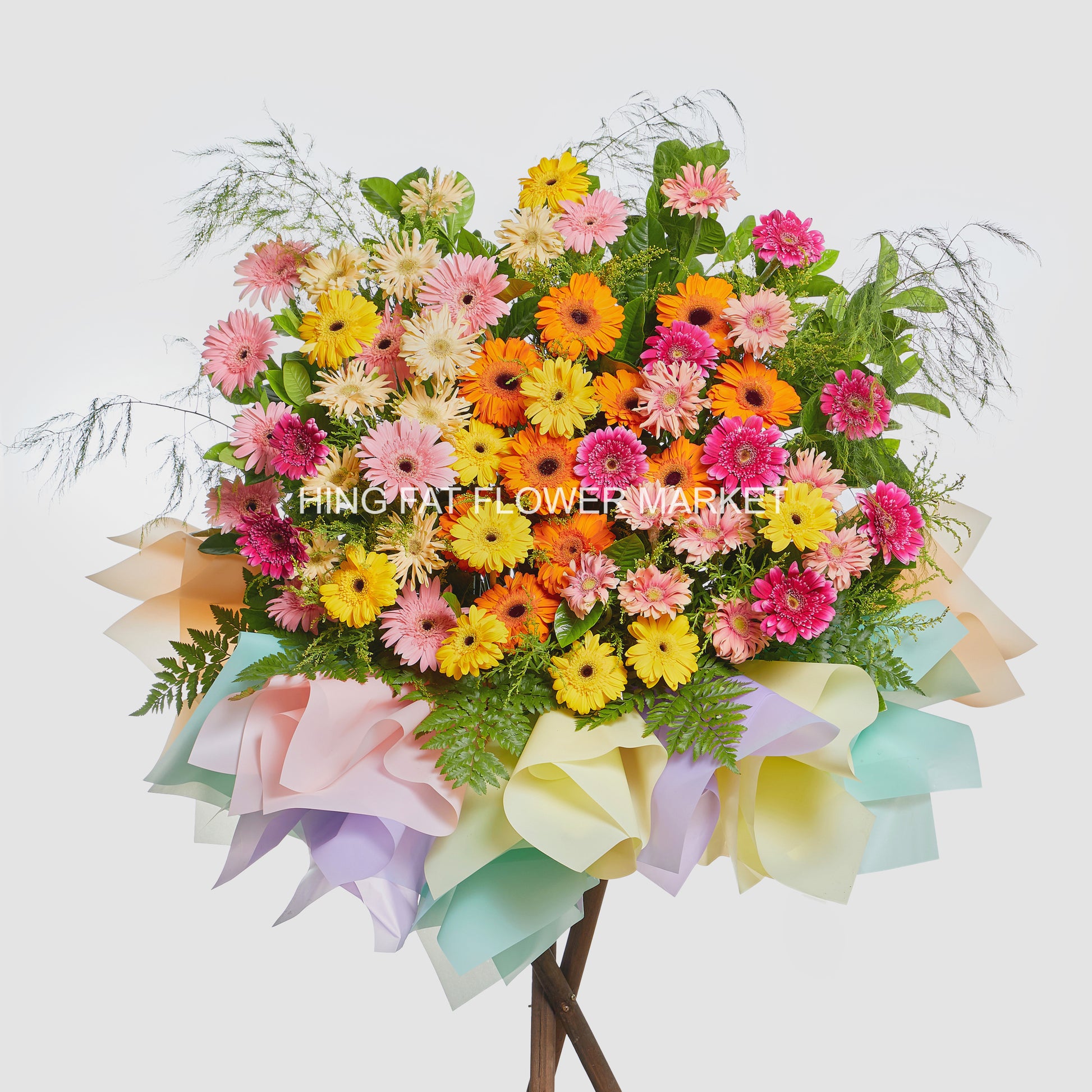 This vibrant and colorful flower stand is a stunning arrangement of various types of gerbera , including shades of pink, yellow, and orange. This flower stand would make an excellent gift for business grand opening or relocation.