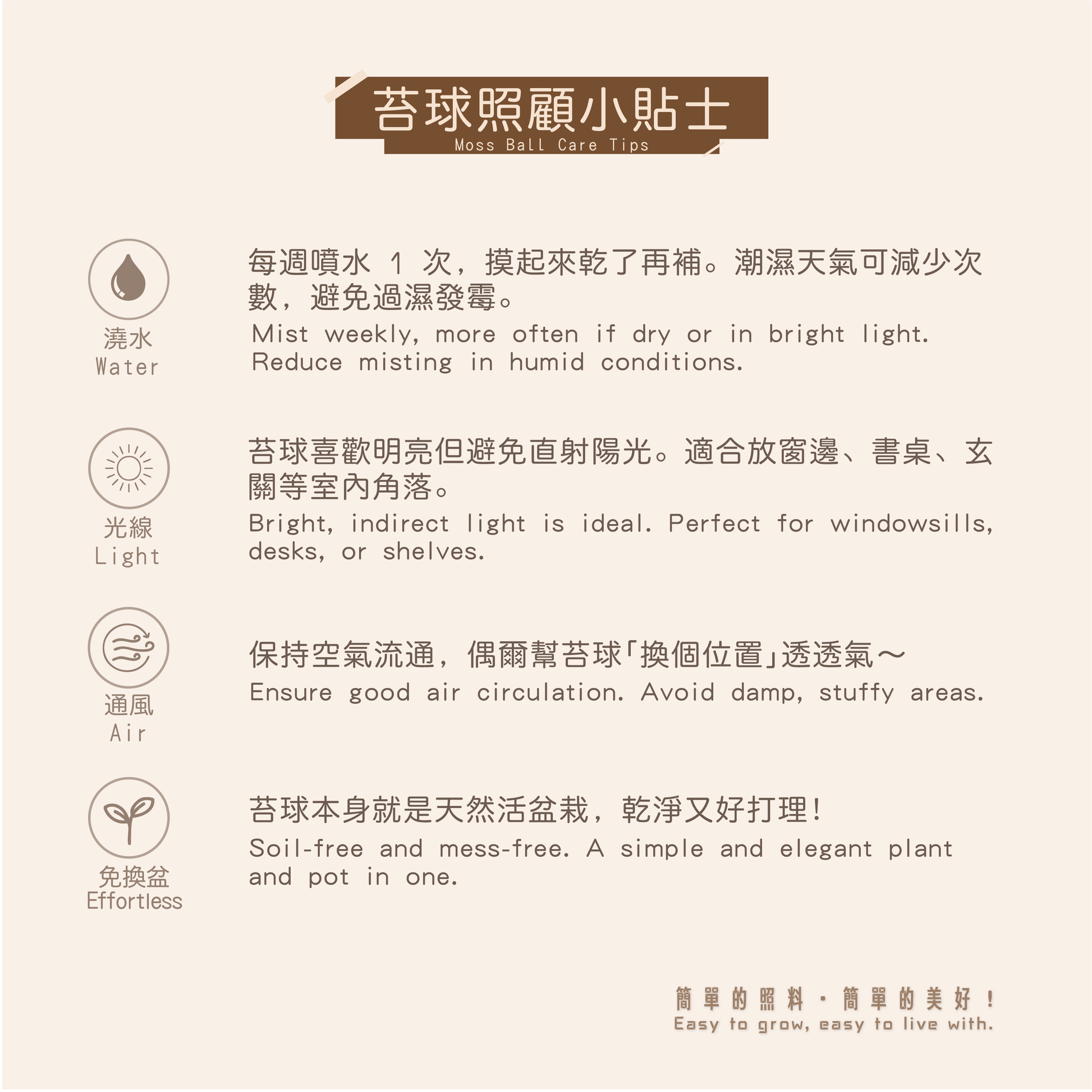 The moss ball is its own natural planter – no soil spills, no need to replant. Clean and simple!