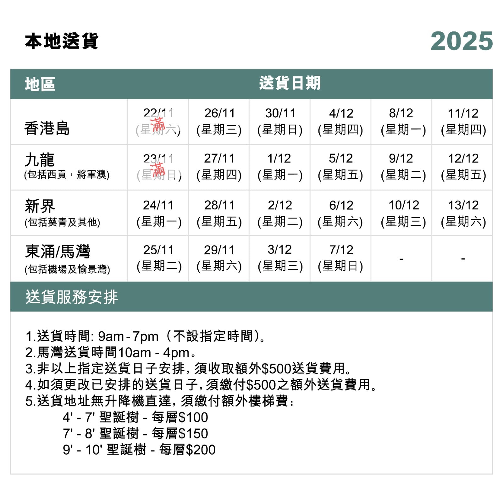 - 沒有安裝新樹座的聖誕樹只提供送貨,不會代客拆樹或安裝舊樹座。