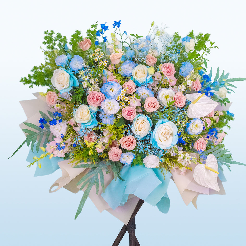 淺藍白玫瑰洋桔梗花籃