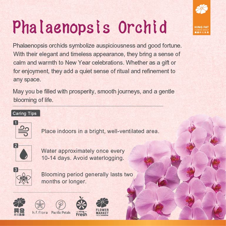 蝴蝶蘭花形端正優雅,象徵吉祥、祝福與好開始,是新春期間深受喜愛的花禮之一。