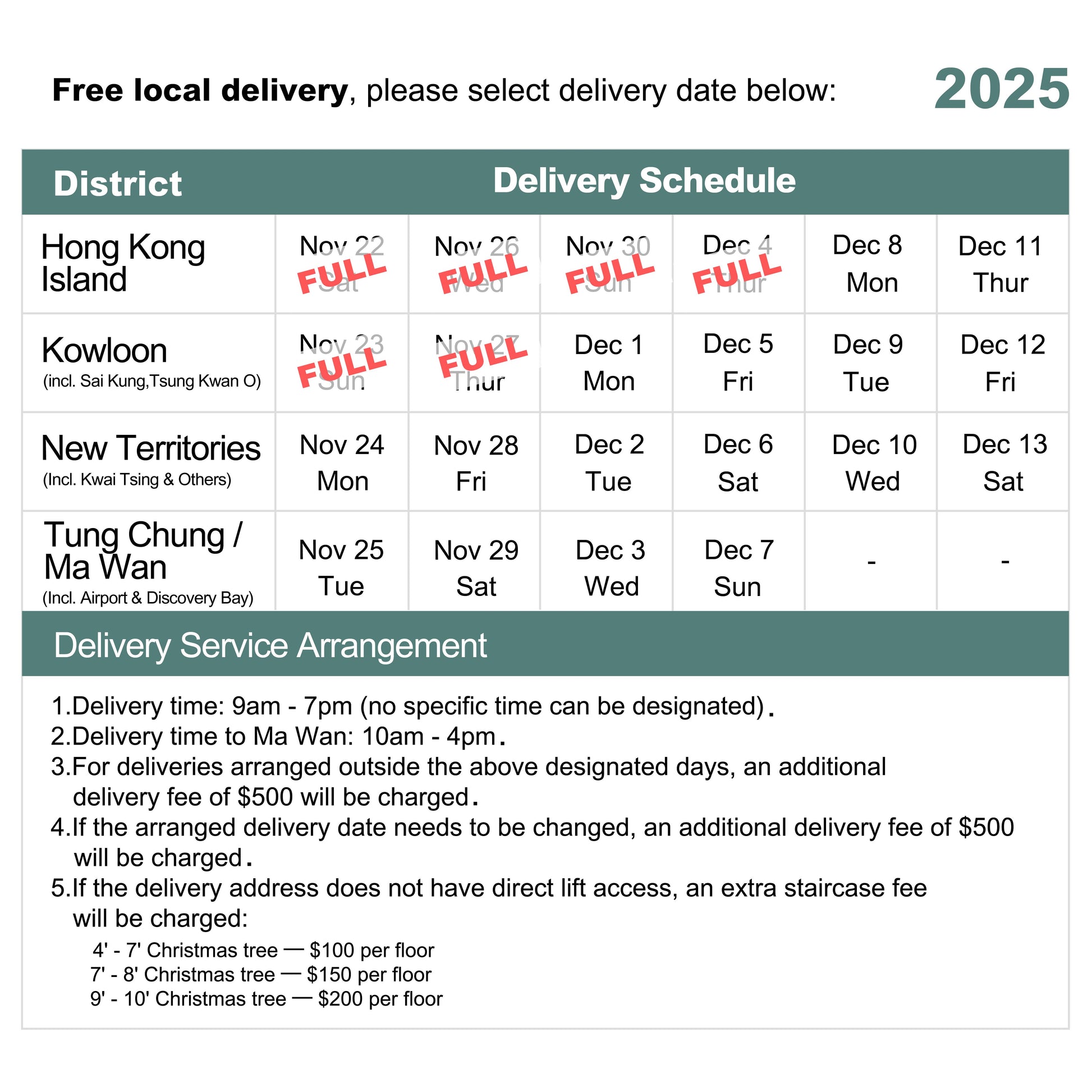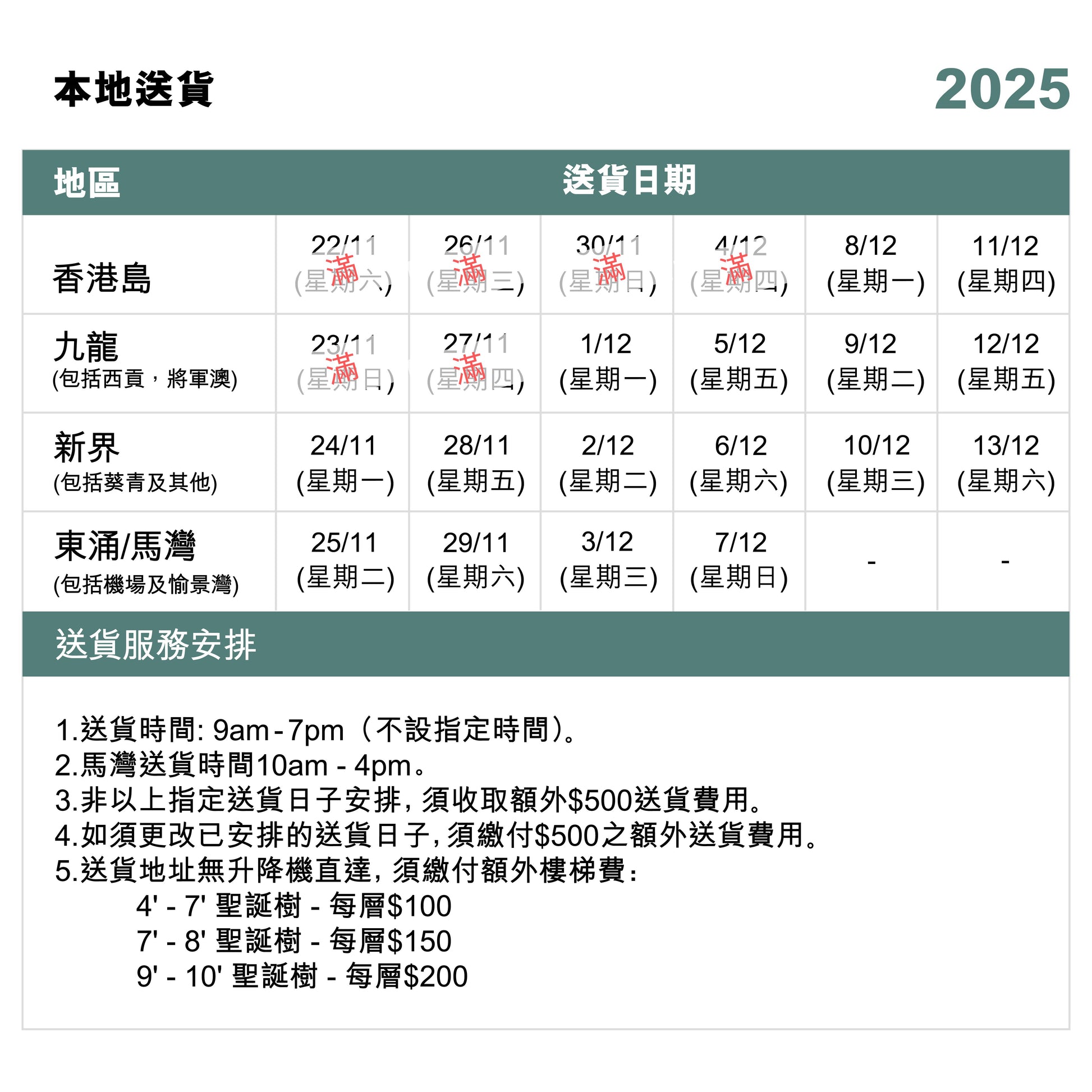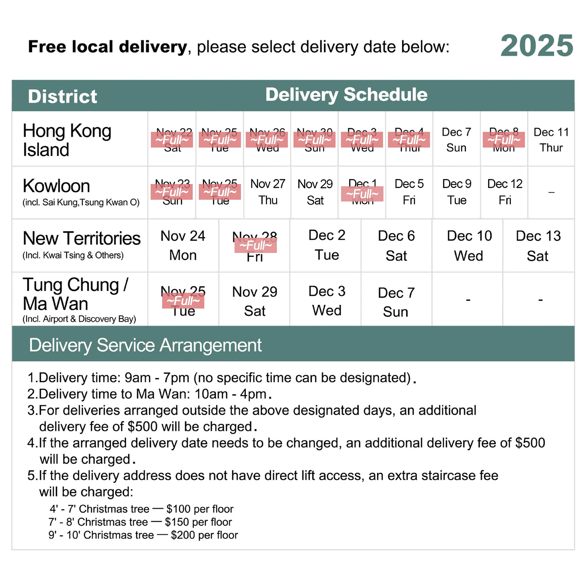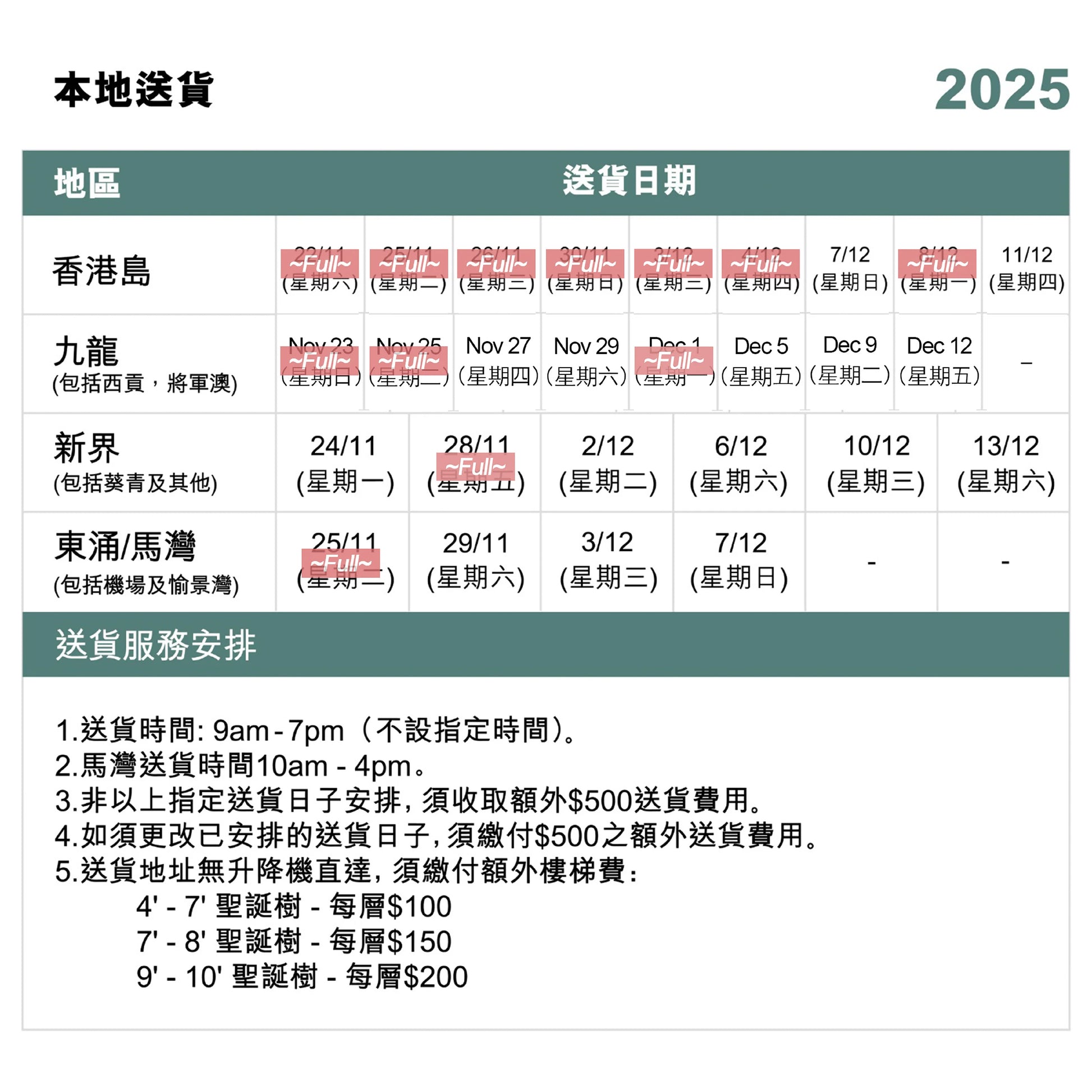 - 沒有安裝新樹座的聖誕樹只提供送貨,不會代客拆樹或安裝舊樹座。
